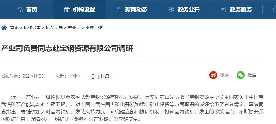 近日,产业司一级巡视员夏农率队赴宝钢资源有限公司调研。夏农同志首先听取了宝钢资源主要负责同志关于中国宝武铁矿石产能规划的专题汇报,并对中国宝武在国内矿山开发和境外矿山投资等方面取得的成绩给予了充分肯定。夏农同志指出,要继续加大对国内铁矿开发的支持力度,研究建立部门协同机制,打通国内铁矿开发上的政策堵点,不断提升我国铁矿石自主保障能力,维护我国钢铁行业产业链、供应链安全。