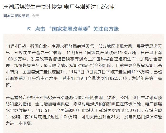 据发改委消息,产运需各方积极应对恶劣天气给能源保供带来的影响,铁路、公路、港口主动采取预防和应对措施,全力增加电煤供应,寒潮对电煤运输的影响正在逐步消除,电厂存煤水平继续提升。11月9日,全国统调电厂供煤大于耗煤再次超过150万吨,存煤突破1.2亿吨,较10月底增加超过1200万吨,可用天数提升至21天,发电供热用煤保障能力进一步提高。