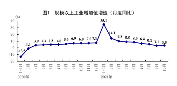 10月份,全国规模以上工业增加值同比增长3.5%,比上月加快0.4个百分点;两年平均增长5.2%,比上月加快0.2个百分点;环比增长0.39%。分三大门类看,采矿业增加值同比增长6.0%,制造业增长2.5%,电力、热力、燃气及水生产和供应业增长11.1%。高技术制造业增加值同比增长14.7%,比上月加快0.7个百分点;两年平均增长10.4%。分产品看,新能源汽车、集成电路、工业机器人产量同比分别增长127.9%、22.2%、10.6%。分经济类型看,国有控股企业增加值同比增长5.2%;股份制企业增长4.2%,外商及港澳台商投资企业增长1.3%;私营企业增长2.4%。1-10月份,全国规模以上工业增加值同比增长10.9%,两年平均增长6.3%。10月份,制造业采购经理指数(PMI)为49.2%,其中,高技术制造业、装备制造业PMI分别为52.0%和51.2%。企业生产经营活动预期指数为53.6%。1-9月份,全国规模以上工业企业实现利润总额63441亿元,同比增长44.7%,两年平均增长18.8%;规模以上工业企业营业收入利润率为6.96%,同比提高1.09个百分点。