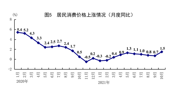10月份,全国居民消费价格(CPI)同比上涨1.5%,涨幅比上月扩大0.8个百分点;环比上涨0.7%。分类别看,食品烟酒价格同比下降0.9%,衣着价格上涨0.5%,居住价格上涨1.7%,生活用品及服务价格上涨0.9%,交通通信价格上涨7.0%,教育文化娱乐价格上涨2.9%,医疗保健价格上涨0.6%,其他用品及服务价格下降0.5%。在食品烟酒价格中,猪肉价格同比下降44.0%,鲜菜价格上涨15.9%,粮食价格上涨0.9%,鲜果价格上涨0.5%。扣除食品和能源价格后的核心CPI同比上涨1.3%,涨幅比上月扩大0.1个百分点。1-10月份,全国居民消费价格同比上涨0.7%。