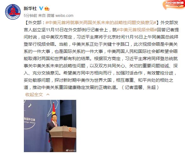 外交部发言人赵立坚11月15日在外交部例行记者会上,就中美元首视频会晤回答记者提问时说,经中美双方商定,习近平主席将于北京时间11月16日上午同美国总统拜登举行视频会晤。当前,中美关系正处于关键十字路口,此次视频会晤是中美关系的一件大事,也是国际关系的一件大事,中美两国人民和国际社会都希望会晤能取得对两国和世界都有利的结果。根据双方商定,习近平主席将同拜登总统就事关中美关系未来的战略性问题,以及双方共同关心、关切的重要问题坦诚、深入、充分交换意见。希望美方同中方相向而行,加强对话合作,有效管控分歧,妥处敏感问题,探讨新时期中美作为世界大国,相互尊重、和平共处的相处之道,推动中美关系重回健康稳定发展的正确轨道。
