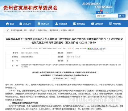 据贵州省发改委官方网站消息,10月22日,贵州省发改委下发调整贵阳市城区及与其共用同一配气管网区域居民用气价格的通知。贵州省发改委在通知中指出,由于上游长输管道供气企业上调居民用气门站价格5%,其它管道气和LNG气源也出现不同程度上涨,其中LNG价格大幅上涨,为理顺价格关系,保障天然气安全稳定供应,贵州省发改委自2021年11月1日起,将属于省级定价的贵阳市城区及与其共用同一配气管网区域居民用气第一、二、三阶梯价格分别上调0.1元/立方米,调整后价格为2.61元/立方米、3.06元/立方米和3.80元/立方米。