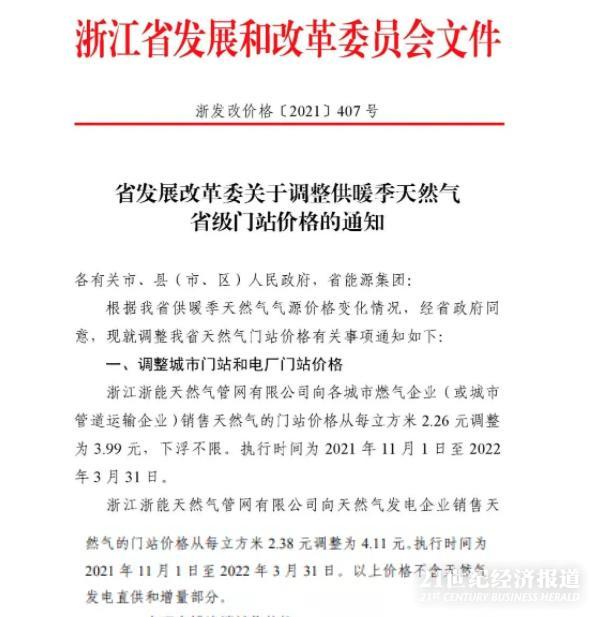 网传一份文件显示,11月17日,浙江省发改委下发关于调整供暖季天然气省级门站价格的通知。通知指出,浙江浙能天然气管网有限公司向各城市燃气企业(或城市管道运输企业)销售天然气的门站价格从2.26元/立方米调整为3.99元/立方米,下浮不限。执行的日期从2021年11月1日至2022年3月22日。