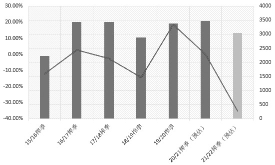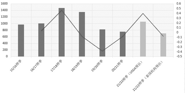 拉尼娜现象将给东南亚地区带来一定的降水,有利于缓解泰国自前年开始发酵的干旱情况。不过泰国多家糖厂认为,即使在雨季,泰国今年的降雨量也预计减少。而且加上糖厂在激烈的甘蔗收购竞争中提高了收购价格,因而今年的甘蔗产量料也出现一定幅度的下滑。另外有行业分析师称,新榨季降雨或在一定程度上恢复,泰国主要的甘蔗生产区的降水量较正常水平增加15至75毫米(中部和东部的部分地区除外),提振泰国2021/2022年度甘蔗产量料至8880万吨,较上年度增加1%。但是总体增产幅度不算特别大。