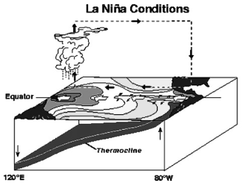 而拉尼娜现象发生就是由于当年沃克循环变得异常强烈,会使东太平洋地区的冷水上翻加速,造成东太平洋地区海水异常寒冷。东南信风将海洋表面被太阳晒热的海水吹向太平洋西部,致使西部比东部海平面增高近60厘米。西部海水温度增高,气压下降,潮湿空气积累形成台风和热带风暴,东部底层海水上翻,致使东太平洋海水变冷。