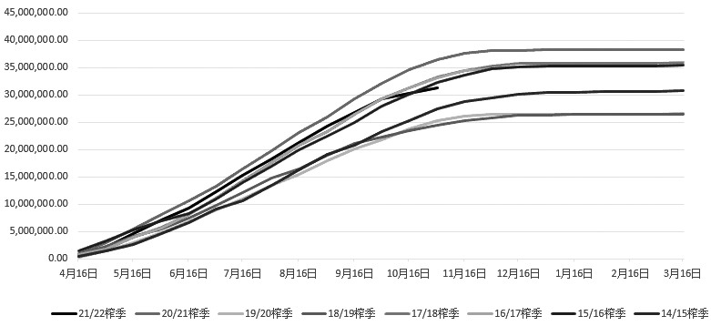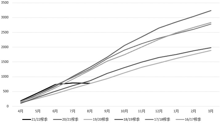 印度方面,2021/2022榨季整体来看天气情况正常,但是得益于燃料乙醇产能的提高,印度糖业协会(ISMA)称,2021/2022榨季该国糖产量为3050万吨,较7月预计的3100万吨略有下调。ISMA称,随着乙醇产能提高和甘蔗产量过剩,预计本年度有340万吨糖将被乙醇生产代替。总体来看,印度产量较去年有一定程度的下滑。