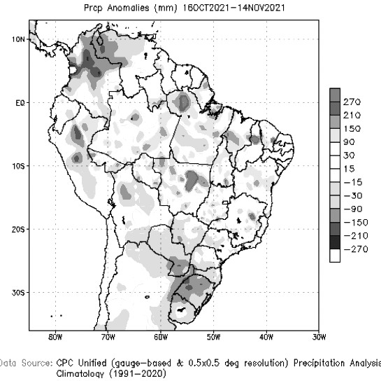 而出口方面,全球最大的粮油食品集团丰益国际称,水资源危机令巴西甘蔗收成的前景恶化。在干旱的影响下,巴西中南部地区的甘蔗产量预计较前一年下降近1亿吨,至5.1亿吨,这将是10年来最低水平,并且有可能进一步下调。而在今年4月,该机构对巴西中南部地区甘蔗产量的预估是5.3亿吨。巴西产量的急剧下降导致一些工厂在10月收榨,巴西外贸部对外贸易秘书处(Secex)公布数据显示,10月截至第四周,巴西食糖和糖蜜累计出口量为171.47万吨;日均出口量为11.43万吨,较去年同期的19.75万吨减少42.13%;出口均价为343.4美元/吨,较去年同期的287.5美元/吨增长19.41%。