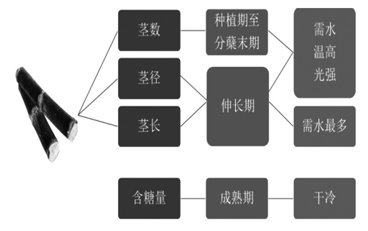 糖产量取决于甘蔗产量和榨糖的出糖率。甘蔗产量取决于甘蔗种植面积和甘蔗的单产,甘蔗的单产取决于茎数、茎径和茎长三个因素:甘蔗的茎数取决于甘蔗种植以后至分蘖末期的生长情况,此时甘蔗需要适量的水分灌溉;甘蔗的茎径和茎长取决于伸长期的生长状况。伸长期是甘蔗生长中最关键的时期,此时甘蔗生长最快,需要大量的水分。