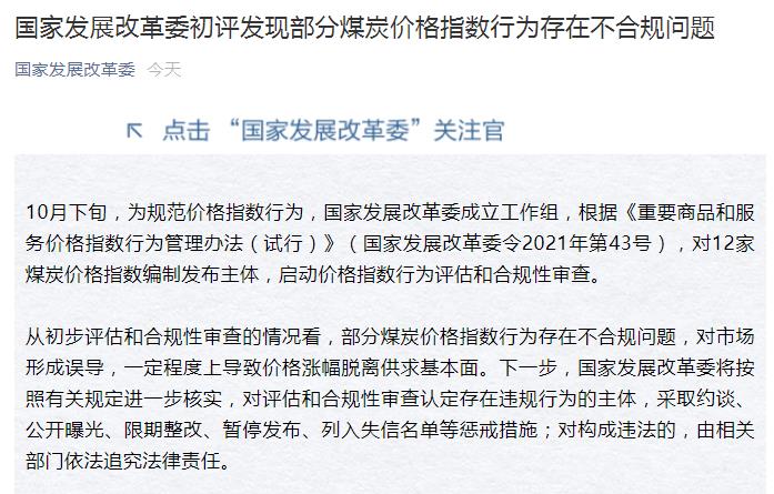 从初步评估和合规性审查的情况看,部分煤炭价格指数行为存在不合规问题,对市场形成误导,一定程度上导致价格涨幅脱离供求基本面。下一步,国家发展改革委将按照有关规定进一步核实,对评估和合规性审查认定存在违规行为的主体,采取约谈、公开曝光、限期整改、暂停发布、列入失信名单等惩戒措施;对构成违法的,由相关部门依法追究法律责任。