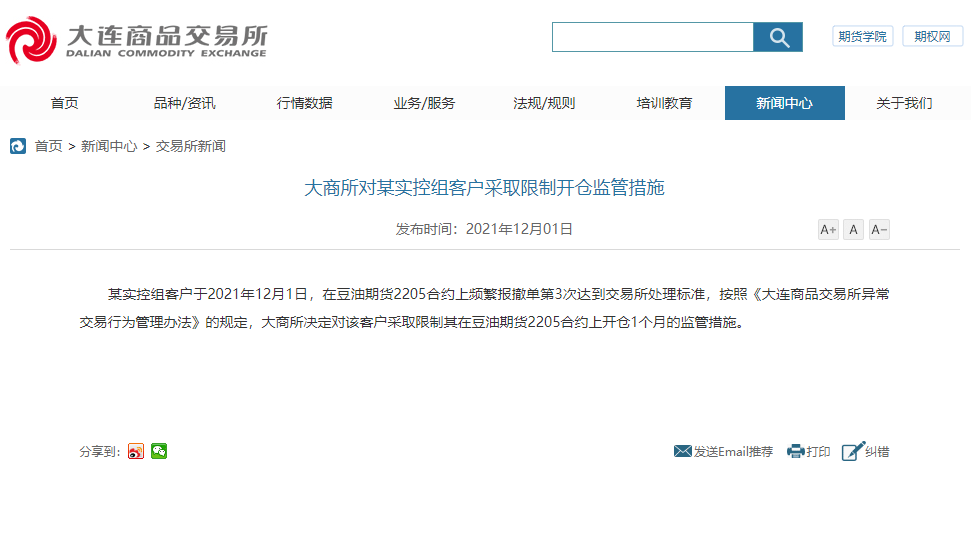 原标题:大商所对一实控组客户采取限制开仓监管措施