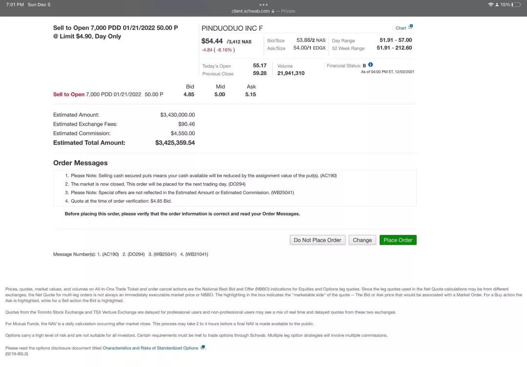 不过,从截图来看,段永平的操作还是比较保守的,通过卖7000张put来看涨拼多多。即别人给他4.9美元,获得一项权力:在2022年1月22日以50美元一股的价格将拼多多卖给他。