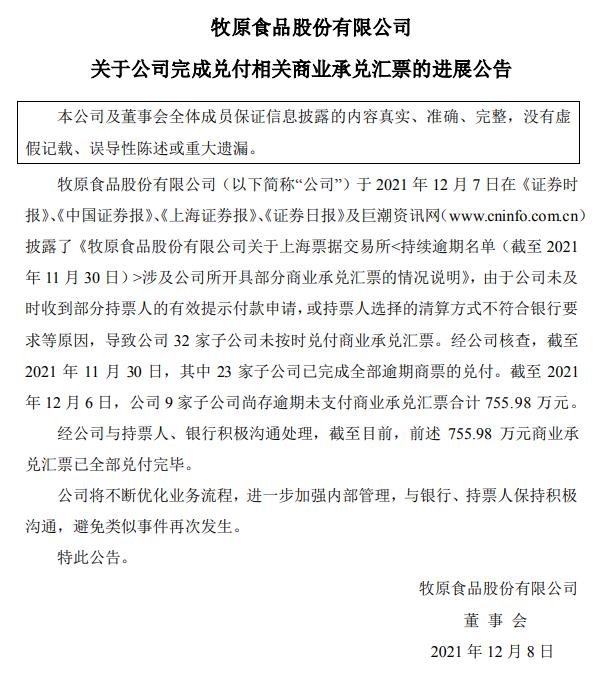 牧原股份公告,截至2021年12月6日,公司9家子公司尚存逾期未支付商业承兑汇票合计755.98万元。经公司与持票人、银行积极沟通处理,截至目前,前述755.98万元商业承兑汇票已全部兑付完毕。