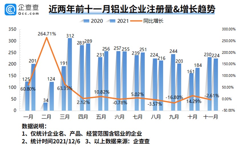 2021年前11月,我国新增铝业相关企业2515家,同比增长11.77%。最近的11月,我国新增铝业相关企业224家,同比减少2.61%。10月新增184家,同比增长14.29%。今年2月新增124家,同比增长264.71%,是前11月中增速最快的月份。