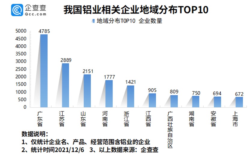 从区域分布来看,广东以4785家铝业相关企业排名第一,江苏、山东分别有2889家、2151家铝业相关企业,排在第二、三名。此后依次为河南省、浙江省、江西省等。