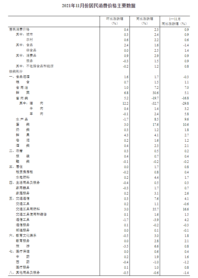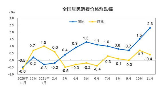 2021年11月份居民消费价格同比上涨2.3% 环比上涨0.4%