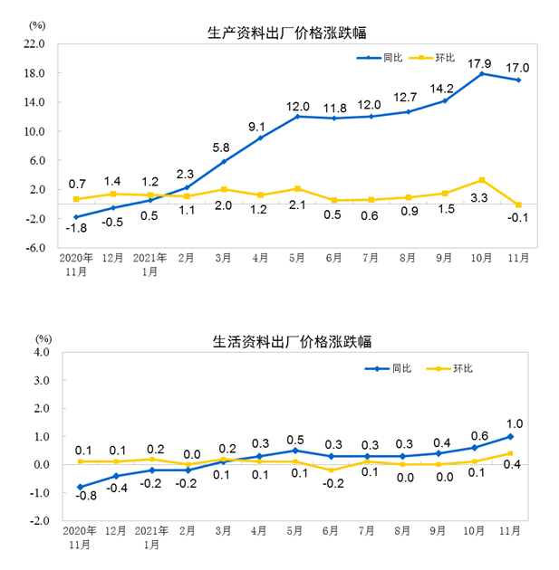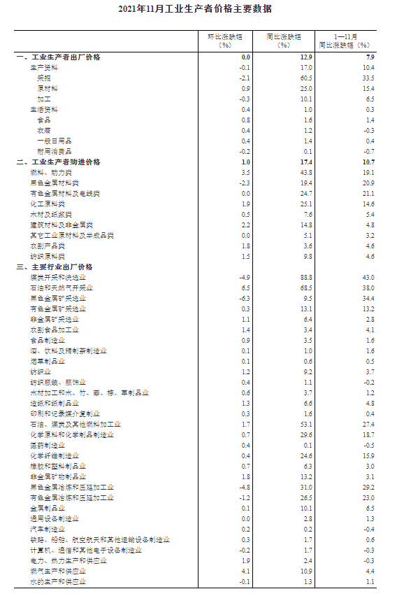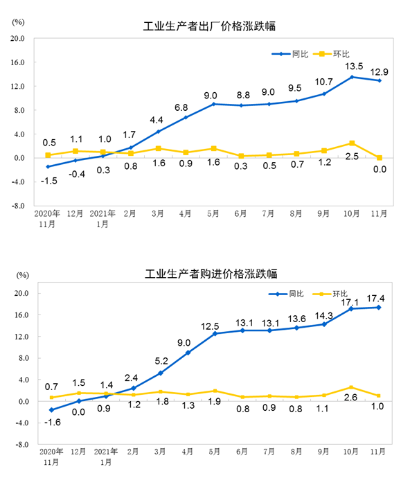 2021年11月份,全国工业生产者出厂价格同比上涨12.9%,环比持平;工业生产者购进价格同比上涨17.4%,环比上涨1.0%。1—11月平均,工业生产者出厂价格比去年同期上涨7.9%,工业生产者购进价格上涨10.7%。