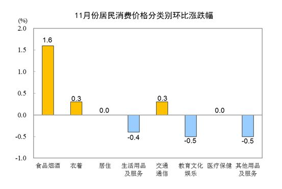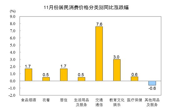 11月份,食品烟酒类价格同比上涨1.7%,影响CPI(居民消费价格指数)上涨约0.49个百分点。食品中,鲜菜价格上涨30.6%,影响CPI上涨约0.60个百分点;蛋类价格上涨17.6%,影响CPI上涨约0.10个百分点;水产品价格上涨8.5%,影响CPI上涨约0.15个百分点;鲜果价格上涨4.1%,影响CPI上涨约0.07个百分点;粮食价格上涨1.5%,影响CPI上涨约0.03个百分点;畜肉类价格下降19.7%,影响CPI下降约0.81个百分点,其中猪肉价格下降32.7%,影响CPI下降约0.68个百分点。