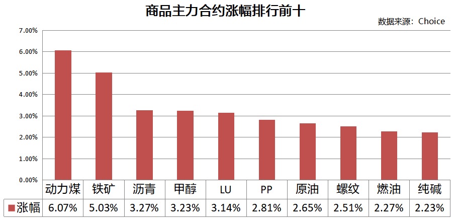 12月13日,国内商品市场大面积飘红,截至日间收盘,黑色和化工两大板块领涨。其中,动力煤收涨逾6%,铁矿石收涨超5%,螺纹钢和热卷板涨超2%。化工品种方面,受国际油价走强支撑,低硫燃油触及涨停,沥青、甲醇涨逾3%;农产品涨跌不一,玉米淀粉涨逾2%,粳稻跌逾2%。