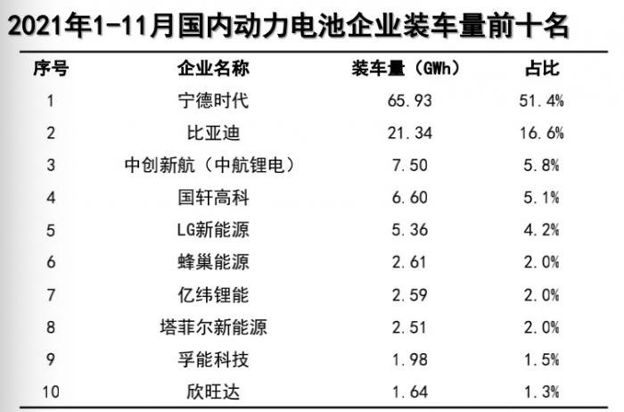 我国动力电池市场集中度水平较高。11月,宁德时代、比亚迪、中航锂电分列国内动力电池装车量前三名,装车量分别为11.45GWh、3.46GWh、1.09GWh,市占率分别为55.0%、16.6%、5.2%。前11月,宁德时代装车量为65.93GWh,市占率为51.4%;比亚迪装车量21.34GWh,市占率为16.6%。
