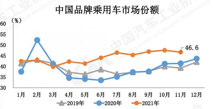 11月,中国品牌乘用车共销售102.2万辆,同比增长7.2%,占乘用车销售总量46.6%,比上年同期提升5.2个百分点。