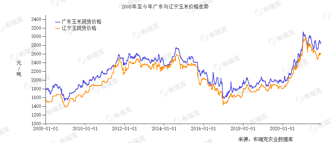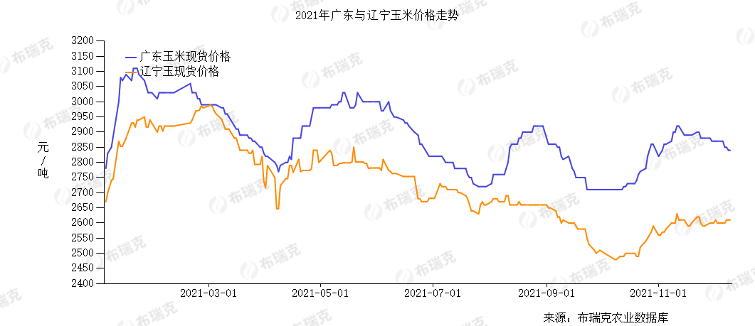 于是,玉米价格出现滞涨,并延续到2021年2月末3月初。随着玉米及替代品陆续到港,玉米供应紧张局面松动,玉米价格出现向下的破位走势。从3月开始,销区与产区“价格倒挂”(价格差小于运费)现象持续三个月,南方销区玉米有价无市,需求锐减至最高七成。受此影响,现货价格走弱,前期大量囤积玉米的贸易商,由于资金利息、仓储费用不断增加,出现市场恐慌,导致9月产区玉米价格一度跌破每吨2400元,较2021年一季度高位下跌500元。