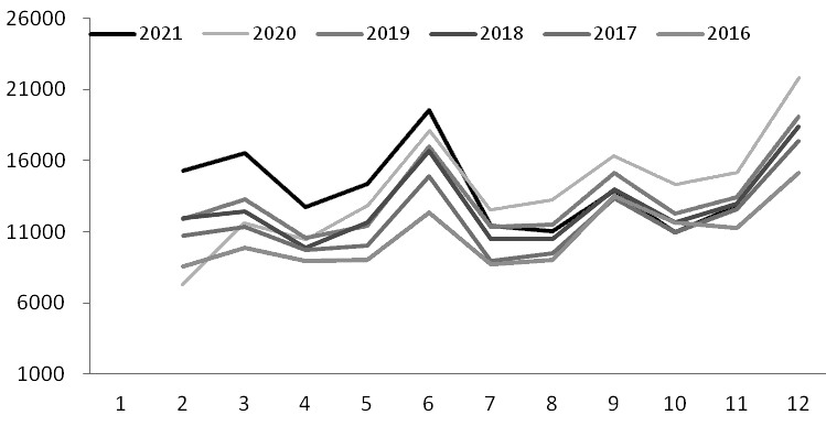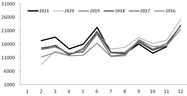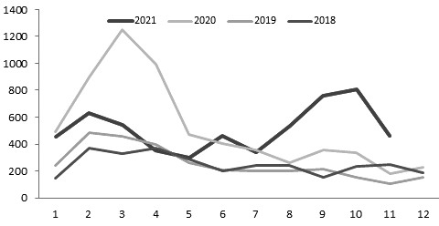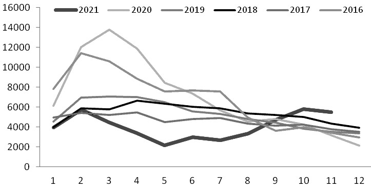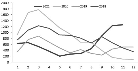 有关数据显示,2021年1—11月,浮法玻璃累计产量100813.5万重量箱,同比增长10.5%,增速比上半年回落0.67个百分点。2021年上半年,浮法玻璃产量增速之所以较高,源于2020年同期玻璃市场低迷运行大量产线冷修的低基数效应。随着二季度及三季度初大量产线复产点火,2021年8月浮法玻璃产量高达9675万重量箱,创出月度产量新的历史纪录。
