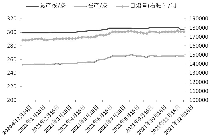截至12月中旬,全国浮法玻璃生产线在产265条,较年初增加13条;日熔量175725吨,较年初增加9450吨,增幅5.7%。