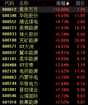 12月23日,煤炭板块持续拉升,截至发稿,焦作万方涨停,华阳股份涨逾9%,靖远煤电、美锦能源、神火股份等多股纷纷跟涨。