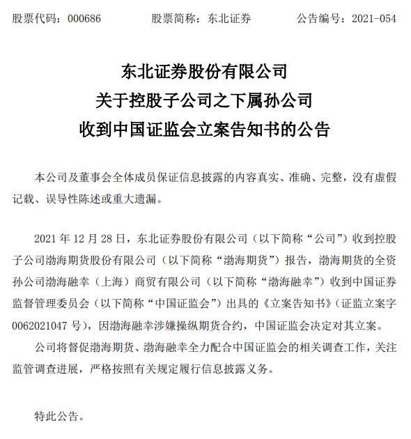 东北证券12月29日晚间公告,控股子公司渤海期货全资孙公司渤海融幸因涉嫌操纵期货合约,证监会决定对其立案。