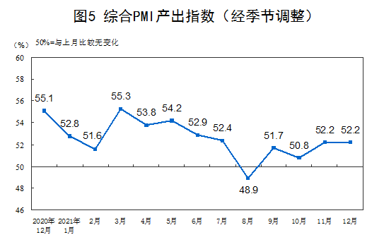 12月份,综合PMI产出指数为52.2%,与上月持平,表明我国企业生产经营活动总体稳定扩张。构成综合PMI产出指数的制造业生产指数和非制造业商务活动指数分别为51.4%和52.7%。