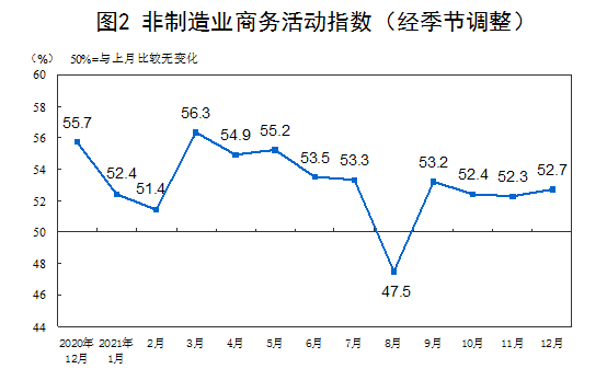 12月份,非制造业商务活动指数为52.7%,比上月上升0.4个百分点,高于临界点,非制造业恢复步伐加快。