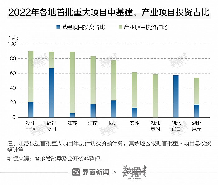 从总投资额来看,在有数据的9地中,基建项目和产业项目投资额之和占比均高于5成,其中,湖北十堰的基建项目和产业项目总投资额占比最高,达到9成。分项目来看,9地中,有7地的产业项目投资额占比高于基建项目投资额占比。