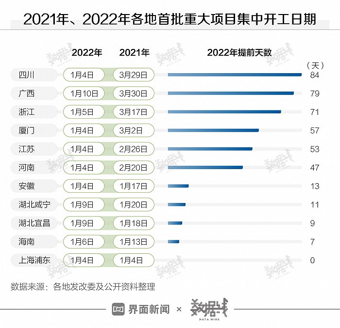 10地提前开工各地开工时间普遍比去年早,有的提前了将近3个月。据界面数据不完全统计,在有数据可比较的11地中,有10地首批重大项目开工时间比去年提前,有一半多的地区2021年首批重大项目开工时间在2月或3月。从提前天数来看,四川提前的天数最多,达84天,接近3个月。只有上海首批重大项目开工时间与去年相同(2022年为上海浦东重大项目开工时间)。