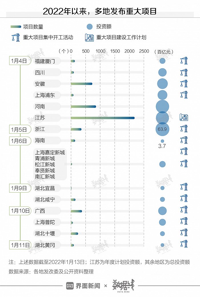 8天内10省份密集开工,投资额3.7万亿元据界面数据不完全统计,2022年1月4日至1月11日,8天内全国至少有15地重大项目密集开工或公布建设计划,涉及10个省份。项目总数超5600个,总投资额约3.7万亿元。