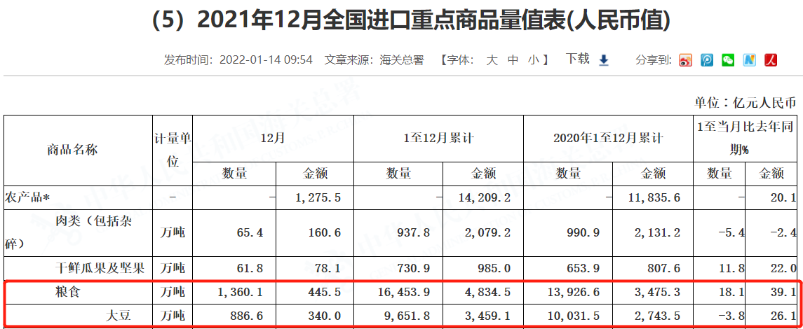 2021年,中国粮食产量取得“十八连丰”,创下新高,同时粮食进口量也创下历史新高。日前,海关总署发布数据,2021年1~12月,中国进口粮食16453.9万吨,同比增长18.1%。其中,进口大豆9651.8万吨,同比下降3.8%。