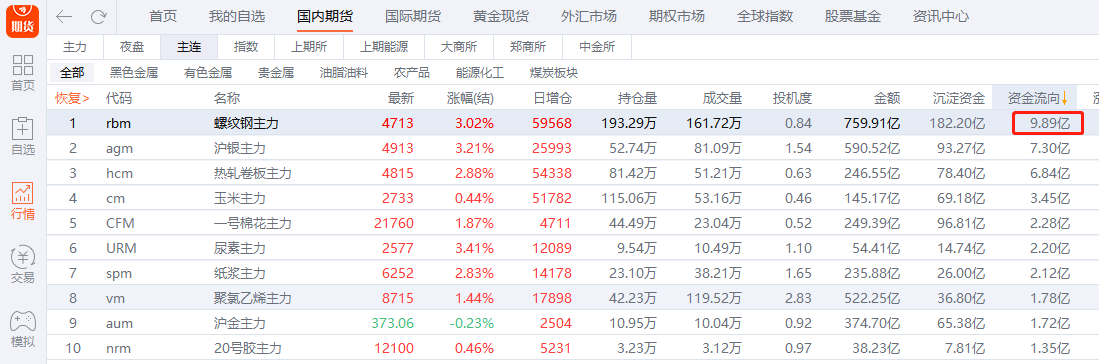 1月19日,资金明显流入螺纹钢期货。东方财富期货数据显示,截至15:00收盘,螺纹钢期货主力合约获得9.89亿元资金流入,成为当日商品期货中资金流入量最大的品种。
