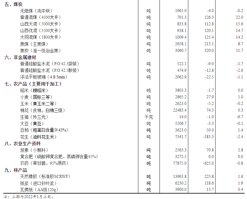 据国家统计局对全国流通领域9大类50种重要生产资料市场价格的监测显示,2022年1月中旬与1月上旬相比,32种产品价格上涨,15种下降,3种持平。其中,生猪(外三元)价格为14.0元/千克,环比下跌6.7%。
