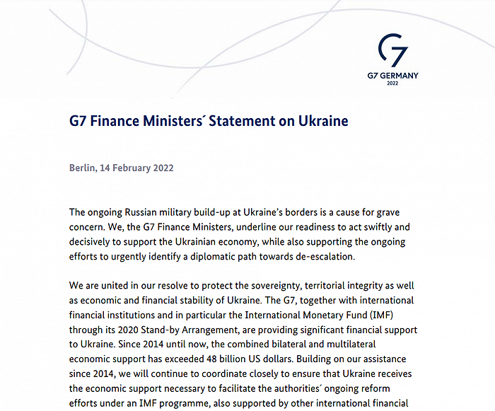 七国集团财长2月14日发布声明称,俄罗斯在乌克兰边境持续的军事集结令人严重关切,七国集团准备迅速果断地采取行动支持乌克兰经济,同时支持正在进行的努力,寻求紧急确定走向缓和局势的外交途径。