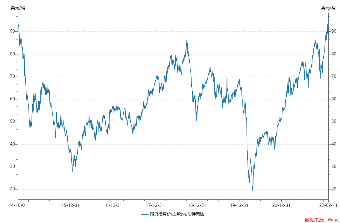 原油可能是今年涨势最为确定的品种。周一,布伦特油价交投于94美元/桶的阶段性新高附近。国际油价距离100美元大关仅一步之遥,而上一次价格来到这附近还要追溯到2014年8月。