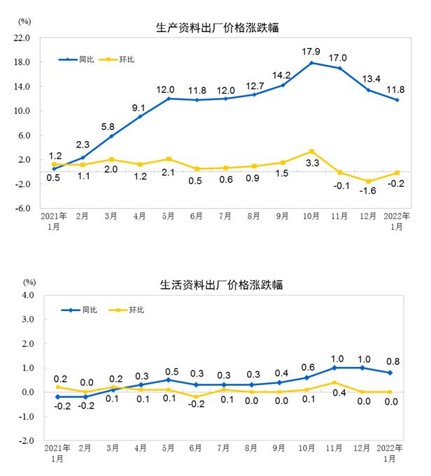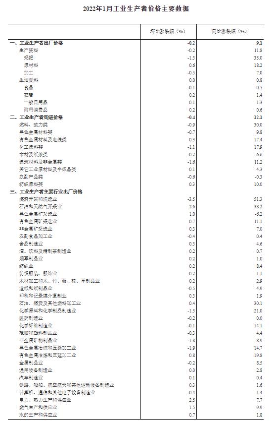 2022年1月份工业生产者出厂价格同比上涨9.1% 环比下降0.2%
