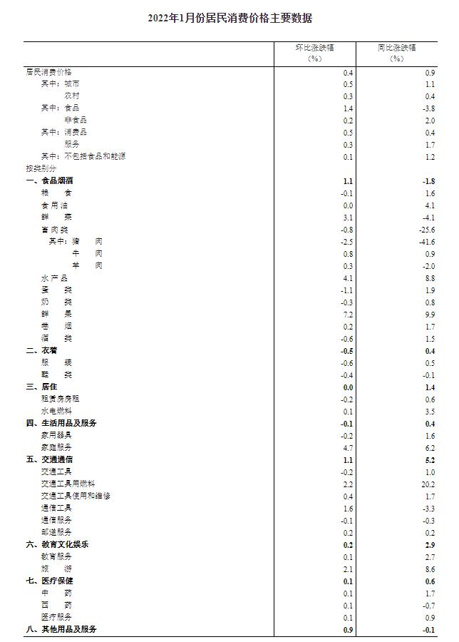 2022年1月份,全国居民消费价格同比上涨0.9%。其中,城市上涨1.1%,农村上涨0.4%;食品价格下降3.8%,非食品价格上涨2.0%;消费品价格上涨0.4%,服务价格上涨1.7%。