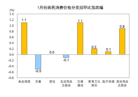 1月份,食品烟酒类价格环比上涨1.1%,影响CPI上涨约0.30个百分点。食品中,鲜果价格上涨7.2%,影响CPI上涨约0.14个百分点;水产品价格上涨4.1%,影响CPI上涨约0.08个百分点;鲜菜价格上涨3.1%,影响CPI上涨约0.07个百分点;蛋类价格下降1.1%,影响CPI下降约0.01个百分点;畜肉类价格下降0.8%,影响CPI下降约0.03个百分点,其中猪肉价格下降2.5%,影响CPI下降约0.04个百分点。