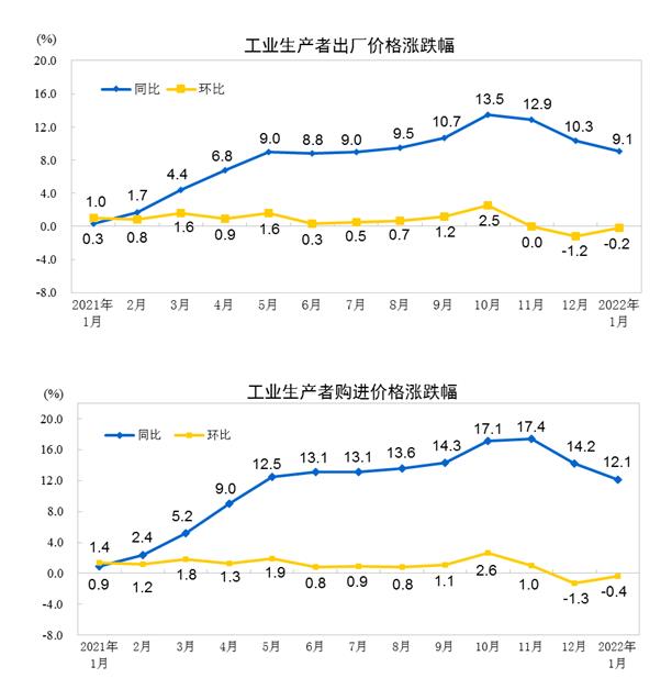 2022年1月份,全国工业生产者出厂价格同比上涨9.1%,环比下降0.2%;工业生产者购进价格同比上涨12.1%,环比下降0.4%。