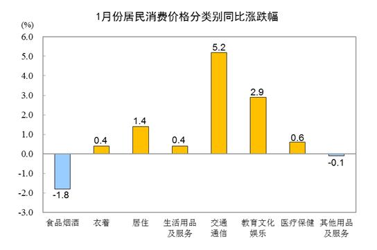 1月份,食品烟酒类价格同比下降1.8%,影响CPI(居民消费价格指数)下降约0.52个百分点。食品中,畜肉类价格下降25.6%,影响CPI下降约1.11个百分点,其中猪肉价格下降41.6%,影响CPI下降约0.96个百分点;鲜菜价格下降4.1%,影响CPI下降约0.10个百分点;鲜果价格上涨9.9%,影响CPI上涨约0.19个百分点;水产品价格上涨8.8%,影响CPI上涨约0.16个百分点;蛋类价格上涨1.9%,影响CPI上涨约0.01个百分点;粮食价格上涨1.6%,影响CPI上涨约0.03个百分点。
