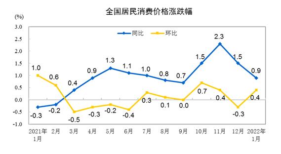 2022年1月份居民消费价格同比上涨0.9% 环比上涨0.4%