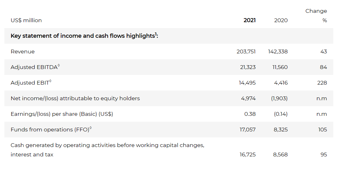 嘉能可2月15日公布的2021年度业绩报告显示,2021年公司实现营收2037亿美元,同比增长43%;调整后的息税折旧及摊销前利润(EBITDA)为213.23亿美元,同比大增84%;归属于股东的净收入为49.74亿美元,基本每股收益0.38美元,而2020年为亏损19.03亿美元,同比扭亏为盈。截止2021年底,嘉能可集团总资产为1275.1亿美元,同比增长8%;净债务60.42亿美元,同比大幅下降62%。