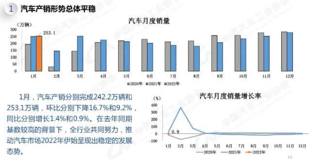 中汽协发布数据,中国1月汽车产销分别完成242.2万辆和253.1万辆,环比分别下降16.7%和9.2%,同比增长1.4%和0.9%。