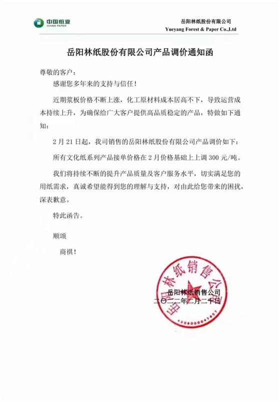 蓝天资源回收店主营废纸回收,店长江化龙谈到当前废纸行情喜于形色,“纸价又涨了,前来拜师学艺的徒弟多了。”废纸涨价的背后是各大上市公司正在陆续调高纸品出厂价。2月19日至2月22日,太阳纸业、晨鸣纸业、APP中国、岳阳林纸相继上调出厂纸价。机构分析师认为,文化纸消费旺季已到,原料供应偏紧,纸价空间看高一线。岳阳林纸工作人员则补充,单一依靠纸价上涨,企业经营难免波动,要行稳致远,还需多条腿走路,当前,岳阳林纸已经在碳汇、园林等领域有所布局和收获。