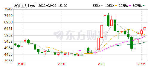废纸价格上涨的背后是各大纸业上市公司均在调高出厂价格。2月19日,晨鸣纸业发布调价函,自2月20日起,文化纸系列产品每吨上调300元。2月20日,岳阳林纸发布调价函,自2月21日起,文化纸系列产品每吨上调300元。2月21日,太阳纸业发布调价函,涂布类全系列产品每吨上调300元。同日,APP(中国)发布调价函,金东、金海所生产的全系列纸张自3月1日起每吨上调300元。不仅现货价格上涨,期货价格也有明显涨幅。东方财富CHOICE终端显示,截至2月22日收盘时,纸浆期货主力合约上涨30元/吨,收于6542元/吨,已连续4个月上涨,自低点4900元/吨上涨至高点6600元/吨,最大涨幅达到34.69%。