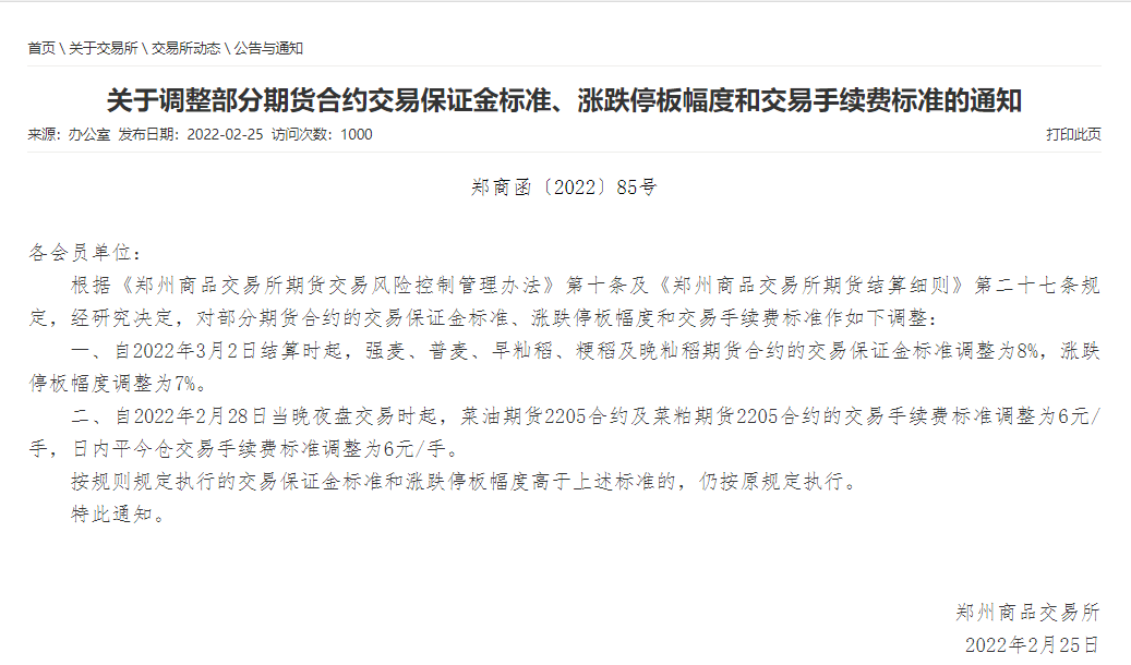 郑商所、大商所调整多个品种交易保证金、涨跌停板幅度和交易手续费